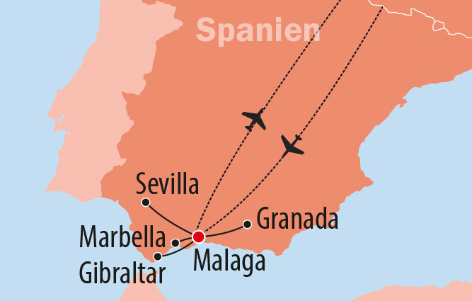 - Flug mit renommierter Fluggesellschaft nach Málaga und zurück (Umsteigeverbindung möglich)