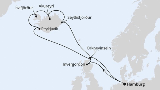 Hamburg – Invergordon – Reykjavik – Ísafjörður – Akureyri – Seyðisfjörður – Orkney Inseln – Hamburg