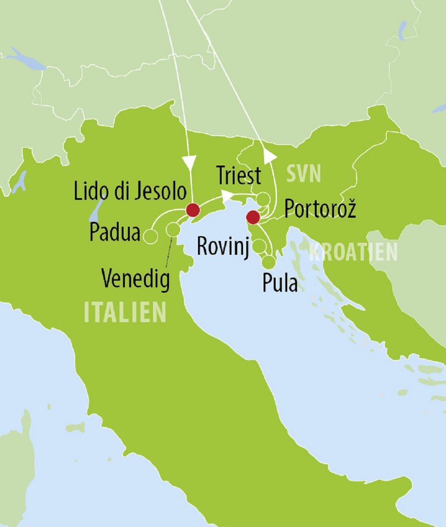 Von Venedigs märchenhafter Lagune über die slowenische Adriaküste bis hin zu den kroatischen Küstenperlen Rovinj und Pula – diese Rundreise entführt Sie zu den Schätzen dreier faszinierender Länder und verbindet einzigartige Städte, malerische Landschaften und mediterranes Lebensgefühl. Ein unvergessliches Erlebnis entlang der Adriaküste!