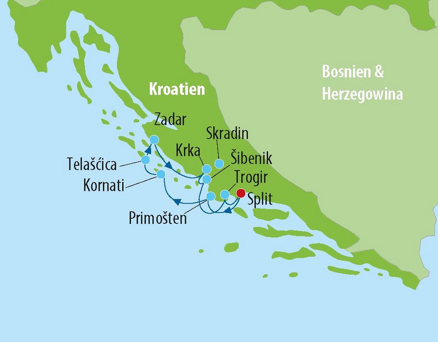 Glasklares Wasser, die Strände, die einmalige Natur, aber ganz besonders die Seele der Region und die Herzenswärme der Menschen und vor allem der Crew an Bord machen diese Reise zu einem ganz besonderen Erlebnis. Kommen Sie mit und lernen Sie die Küste Kroatiens von einer neuen Perspektive aus kennen. Ob durch die zahlreichen kleinen Inseln des Kornati-Nationalparks mit seiner unberührten Natur oder die rauschenden Wasserfällen im Krka-Nationalpark - hier kommen Naturfreunde ganz auf ihre Kosten.