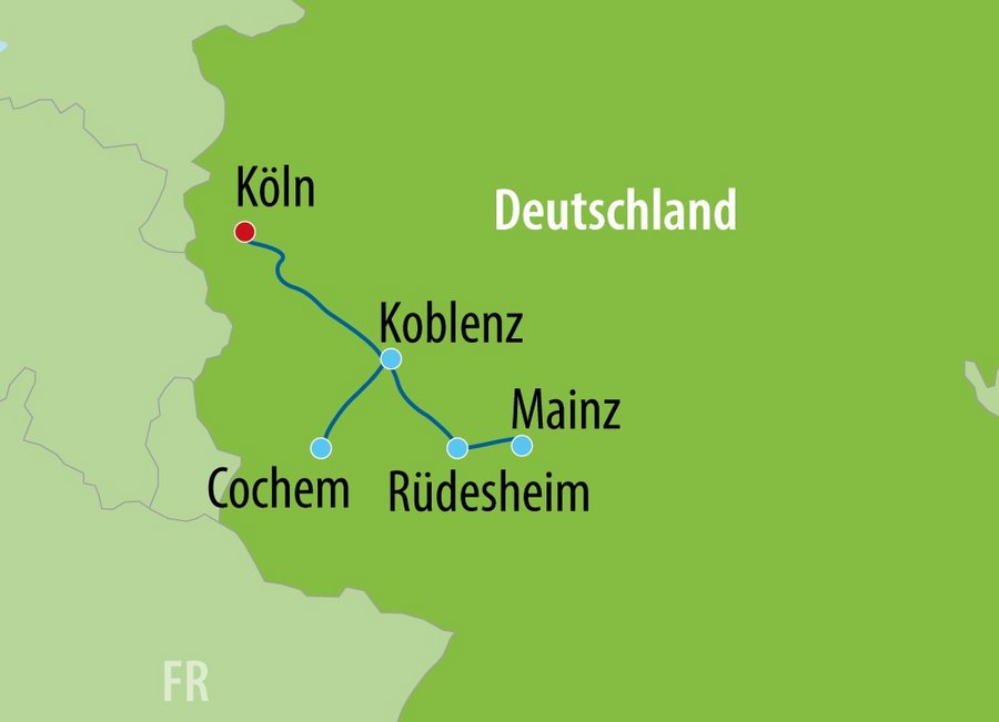 Kommen Sie mit uns und erleben Sie eine Schiffsreise auf Rhein und Mosel durch das Herz Europas! Auf Ihrer Reise passieren Sie wunderbare Weinregionen, zahlreiche Schlösser und Burgen und erleben dabei wechselnde Uferlandschaften. Unterwegs besuchen Sie bedeutende, geschichtsträchtige Städte wie Köln, Trier und Koblenz und können die sagenumwobene Loreley bestaunen.
