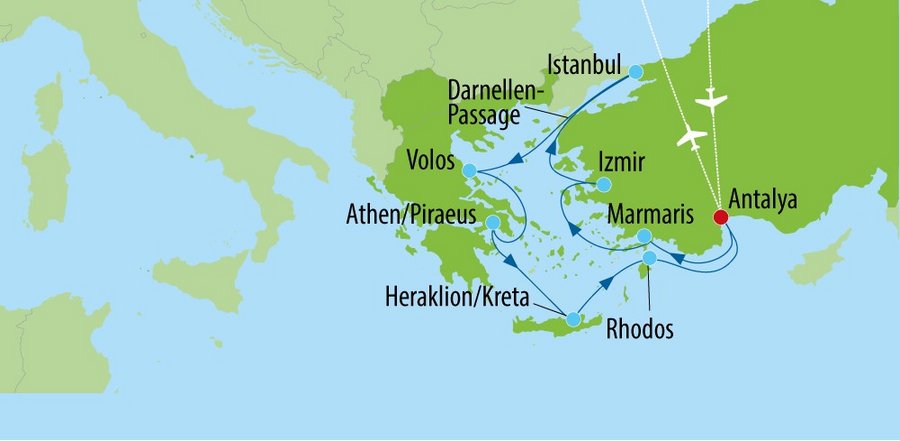 Antalya - Marmaris - Izmir - Istanbul - Volos - Athen - Santorin - Rhodos