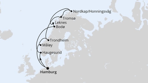 Hamburg – Haugesund – Bodø – Leknes – Nordkap – Tromsø – Trondheim – Måløy